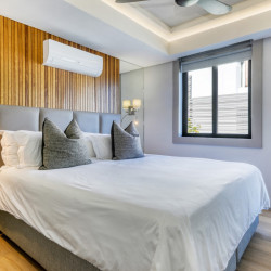 The third bedroom features a king-sized bed that can be converted into two single beds, built-in cupboards, and a private bathroom with a spacious rain shower and a single vanity. This bedroom has air-conditioning, Smart TV and partial ocean views.