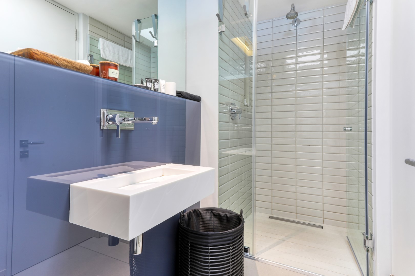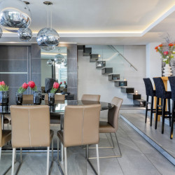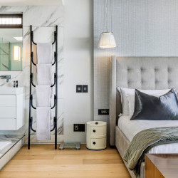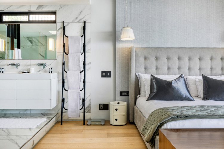 The stylish décor and cool grey tones of the first level flow into the second level of the apartment, which features three bedrooms. These include a beautiful master bedroom and, en-suite bathroom and two guest bedrooms, one with an en-suite bathroom and the other a private dedicated bathroom.