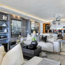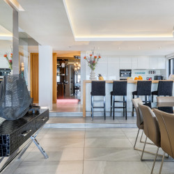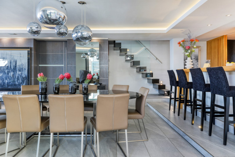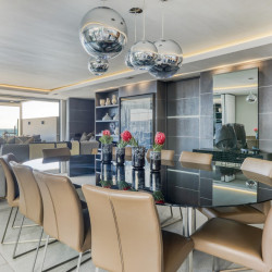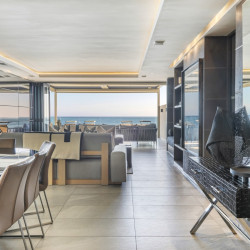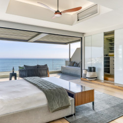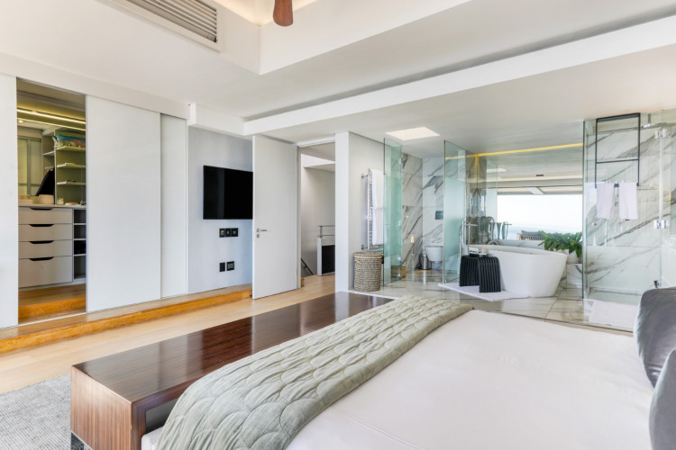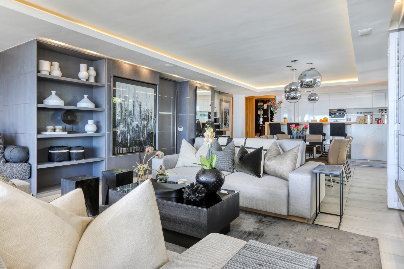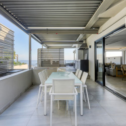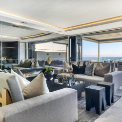 Accessed by a lift from the under cover parking garage, the apartment opens onto a beautiful double-volume living space which is stylishly furnished with designer décor and beautiful artworks. The open-plan living area features a comfortable lounge with a gas fireplace, Large Smart TV, and a dining area with a 10-seater dining table. Glass folding sliding doors allow the lounge to open out onto a large, shaded terrace with a swimming pool, an outdoor lounge, sun loungers, and 180 degree magnificent ocean views. The terrace wraps around the side of the building where there is an outdoor bar area with a gas barbecue and all the facilities for alfresco outdoor dining.