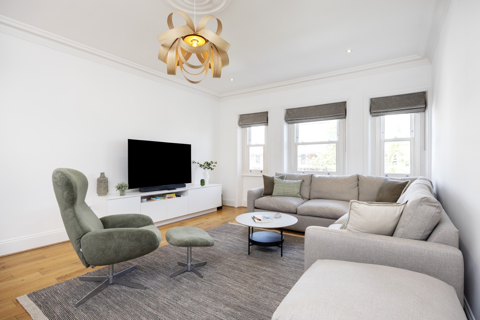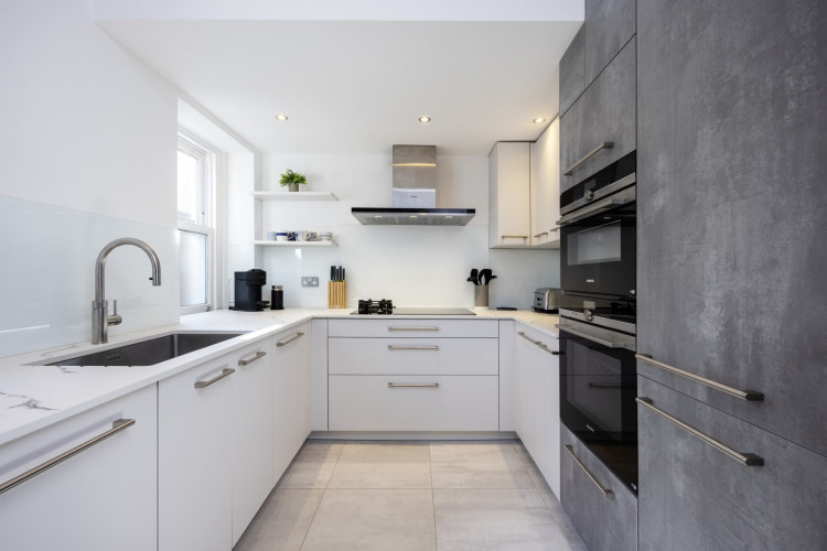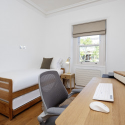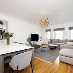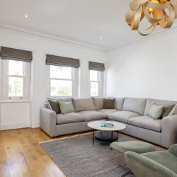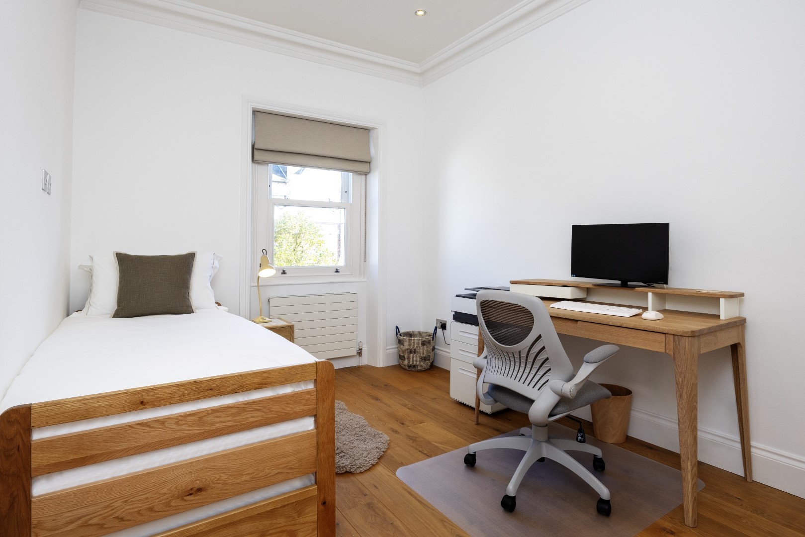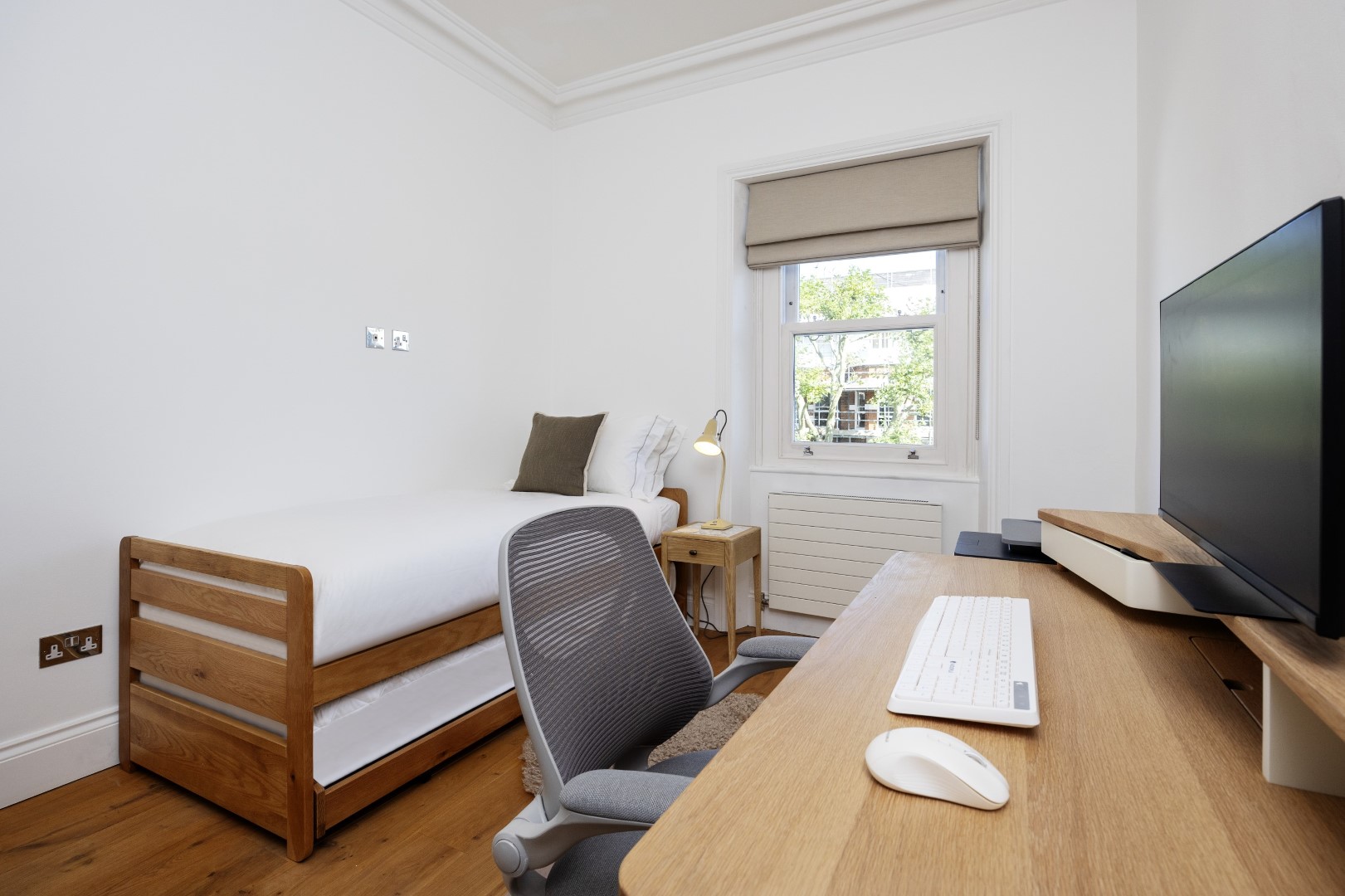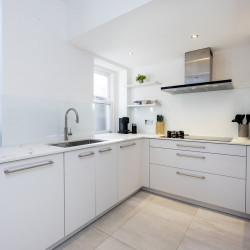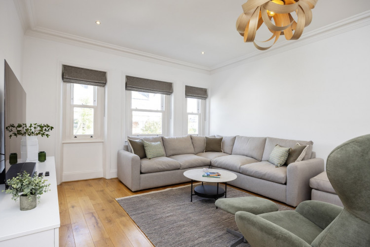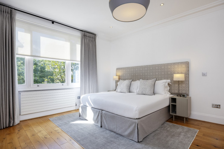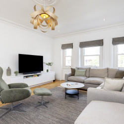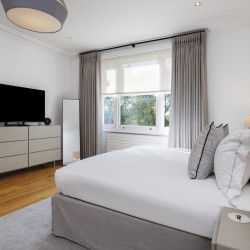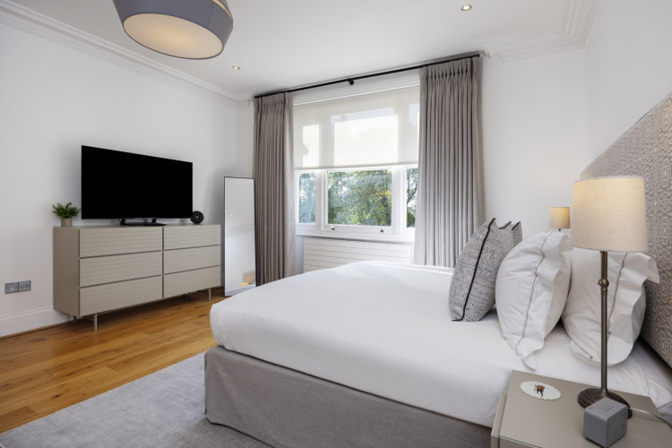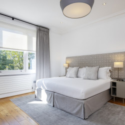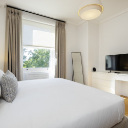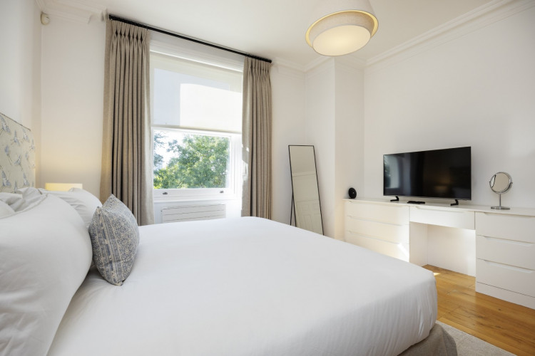Offering serene views across this leafy quarter of London, the principal suite is pared-back in style. Reposeful with whitewashed walls and wood floors, the room plays host to a plush super king-sized bed, chest of drawers and flat-screen TV. A dash of design exuberance is served up in the en-suite bathroom, where opulent marble tiling adds a touch of grandeur to a room comprising a lavish roll-top bath, walk-in shower and toilet. Neutral tones enshrine a peaceful atmosphere in the second bedroom, home to a super king-sized bed and generous sliding wardrobes. Worker bees may find themselves drawn to the third bedroom courtesy of its smart home office space, while a versatile trundle bed means this room can also sleep two guests. Adding a final touch of gloss with its travertine tile effect, the capacious family bathroom offers a bath with built-in shower, wash basin and toilet.