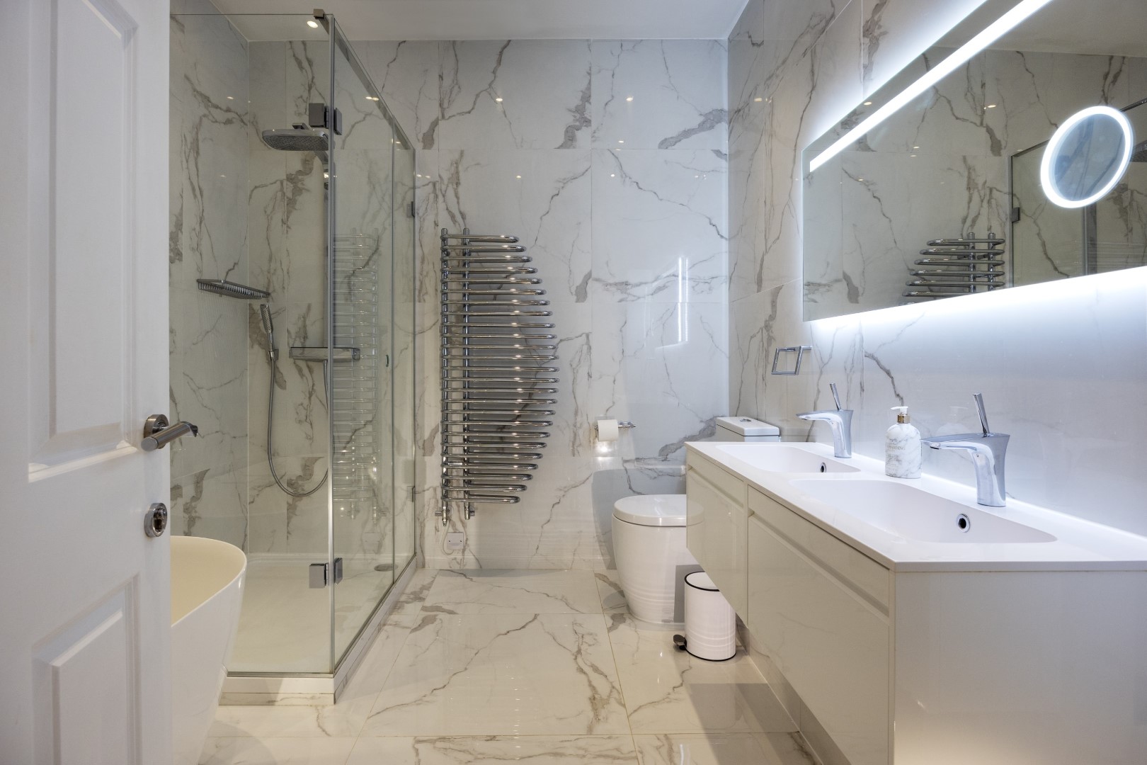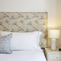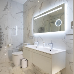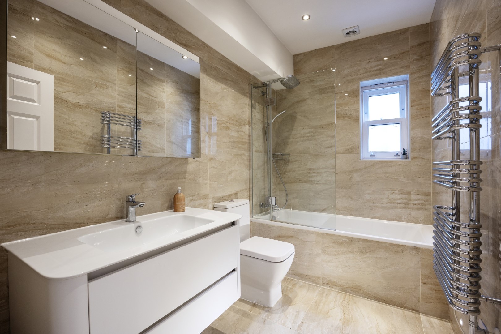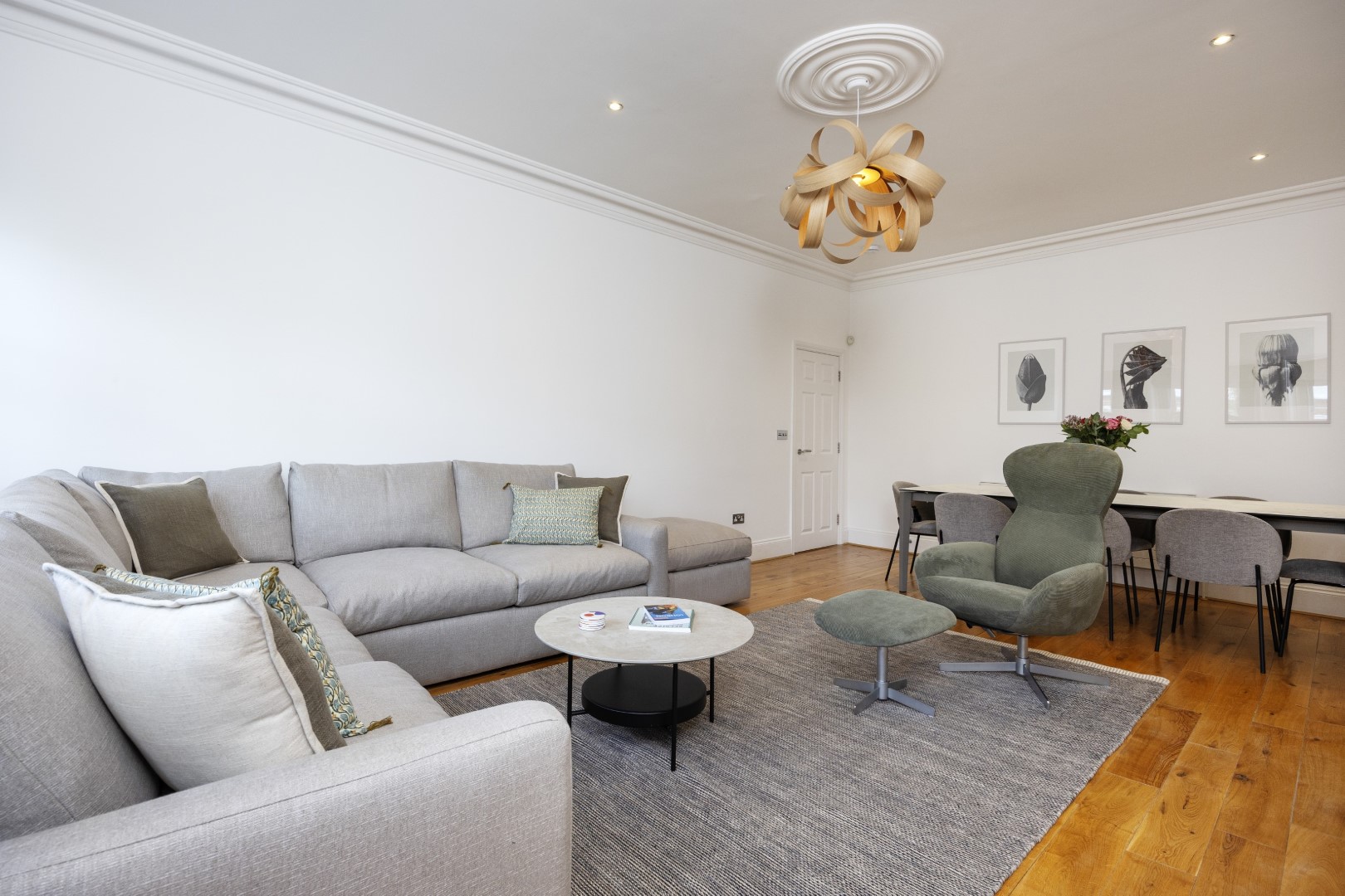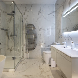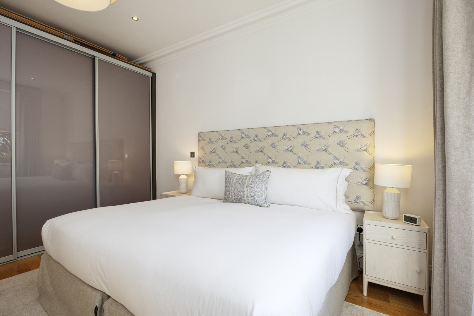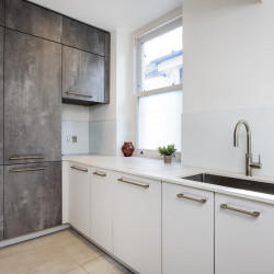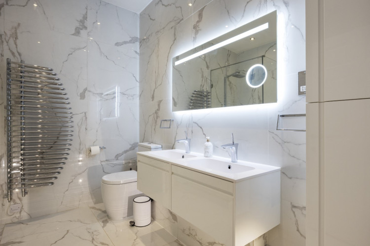 Offering serene views across this leafy quarter of London, the principal suite is pared-back in style. Reposeful with whitewashed walls and wood floors, the room plays host to a plush super king-sized bed, chest of drawers and flat-screen TV. A dash of design exuberance is served up in the en-suite bathroom, where opulent marble tiling adds a touch of grandeur to a room comprising a lavish roll-top bath, walk-in shower and toilet. Neutral tones enshrine a peaceful atmosphere in the second bedroom, home to a super king-sized bed and generous sliding wardrobes. Worker bees may find themselves drawn to the third bedroom courtesy of its smart home office space, while a versatile trundle bed means this room can also sleep two guests. Adding a final touch of gloss with its travertine tile effect, the capacious family bathroom offers a bath with built-in shower, wash basin and toilet.