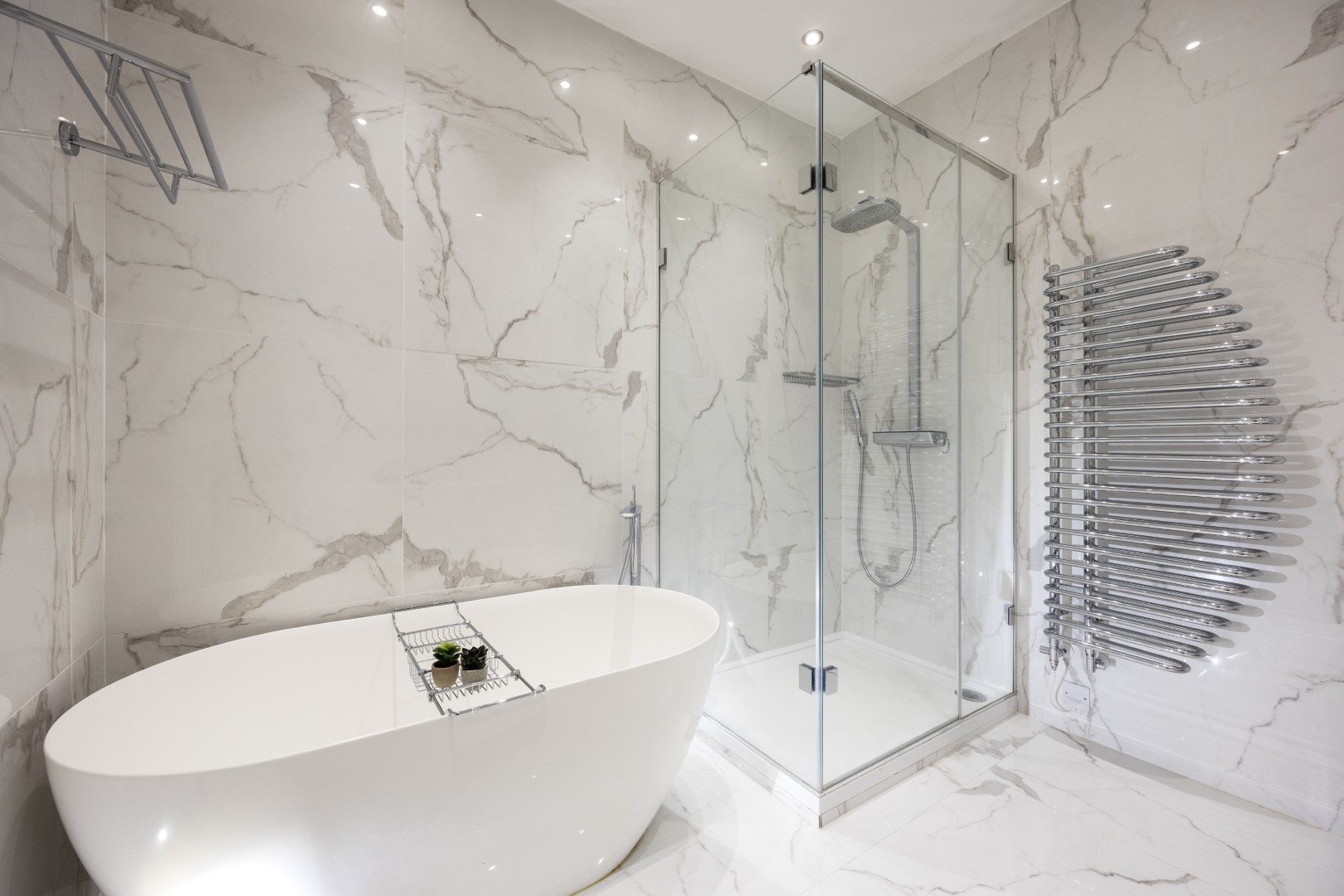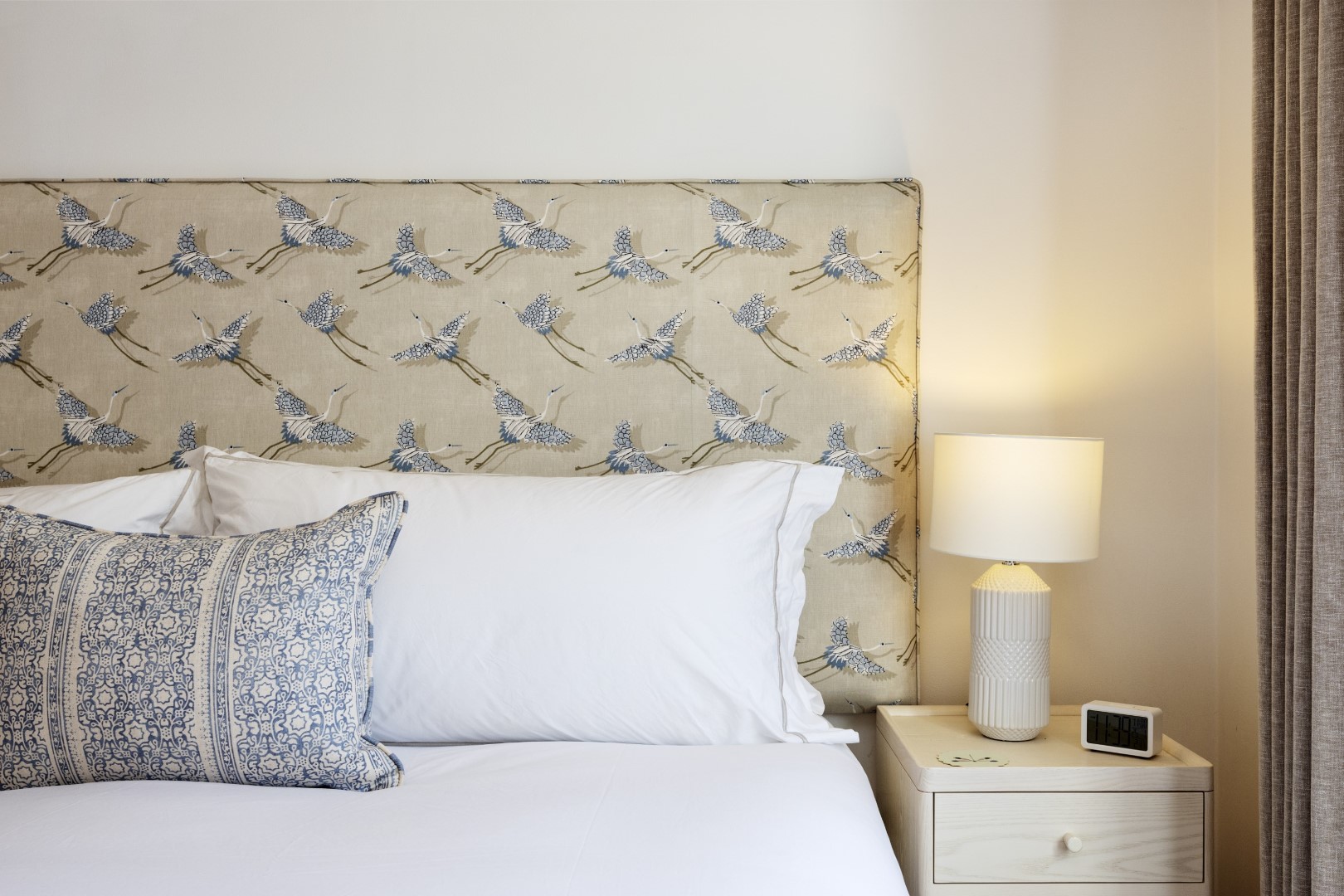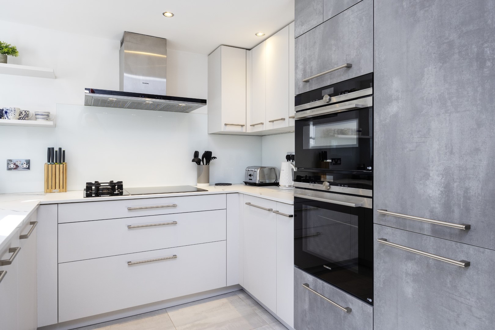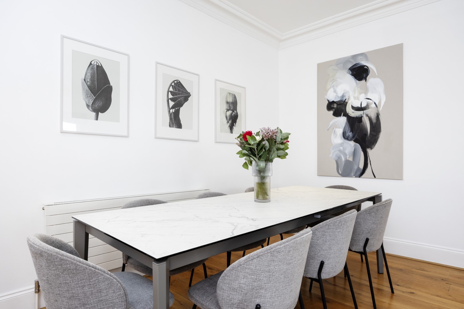 Offering serene views across this leafy quarter of London, the principal suite is pared-back in style. Reposeful with whitewashed walls and wood floors, the room plays host to a plush super king-sized bed, chest of drawers and flat-screen TV. A dash of design exuberance is served up in the en-suite bathroom, where opulent marble tiling adds a touch of grandeur to a room comprising a lavish roll-top bath, walk-in shower and toilet. Neutral tones enshrine a peaceful atmosphere in the second bedroom, home to a super king-sized bed and generous sliding wardrobes. Worker bees may find themselves drawn to the third bedroom courtesy of its smart home office space, while a versatile trundle bed means this room can also sleep two guests. Adding a final touch of gloss with its travertine tile effect, the capacious family bathroom offers a bath with built-in shower, wash basin and toilet.