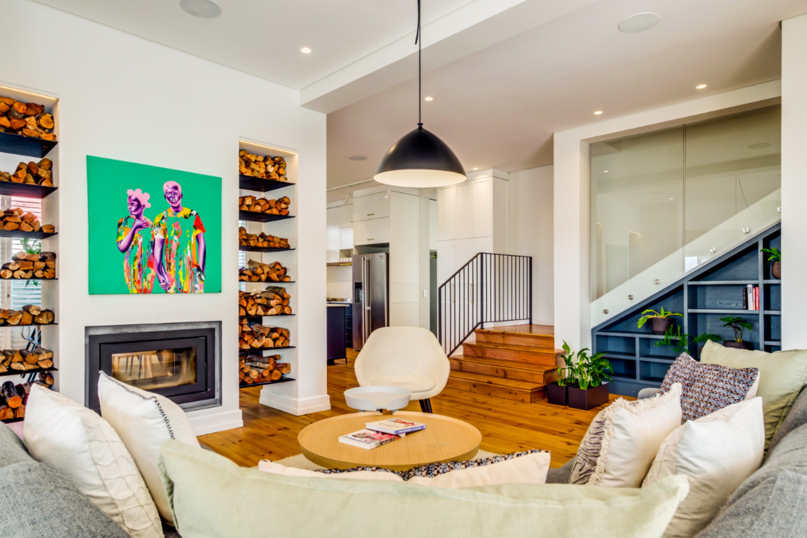 There is a main lounge with a wood-burning fireplace as well as a reading/TV nook, a study, and an open-plan dining area on the ground level.