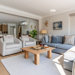 The open-plan living area is the heart of the home, where the kitchen, dining area, and lounge flow together, creating a bright and welcoming atmosphere.