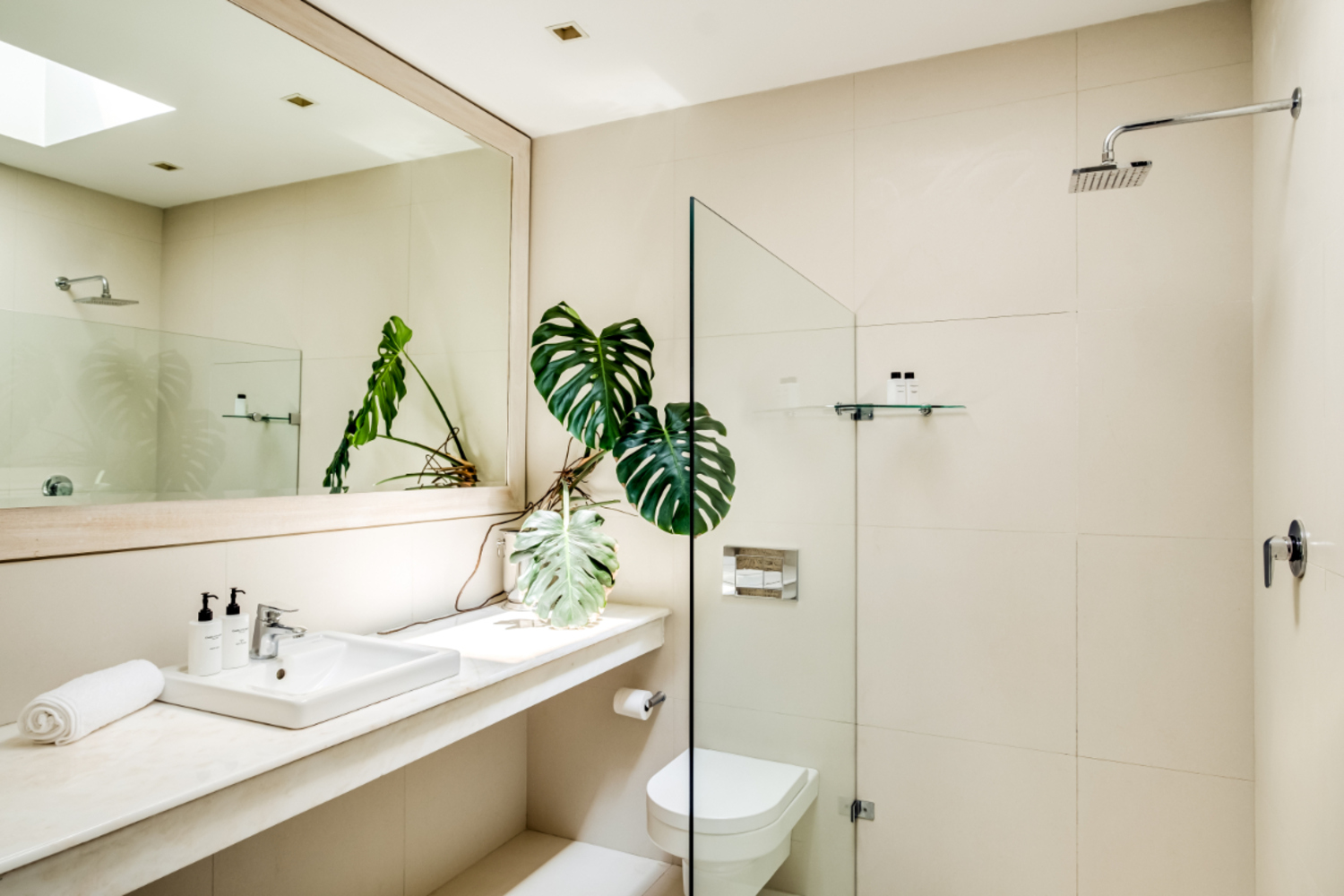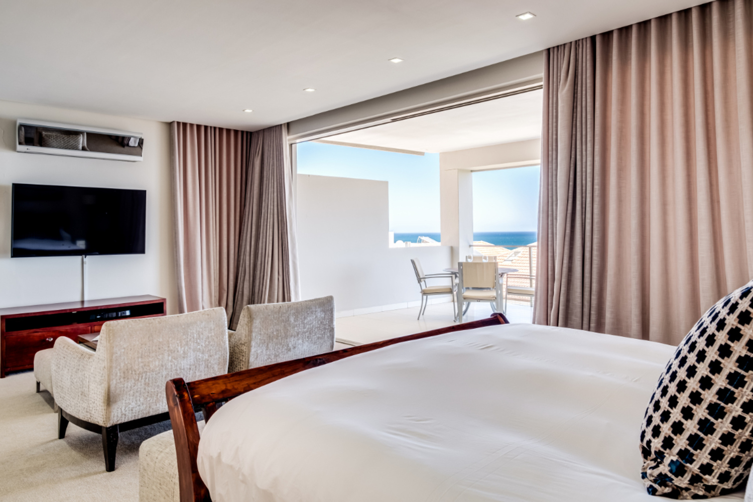 The main bedroom features a king bed, air conditioning, and an open ensuite with both bath and shower, leading to a private balcony where dining at sunset becomes an evening spectacle.