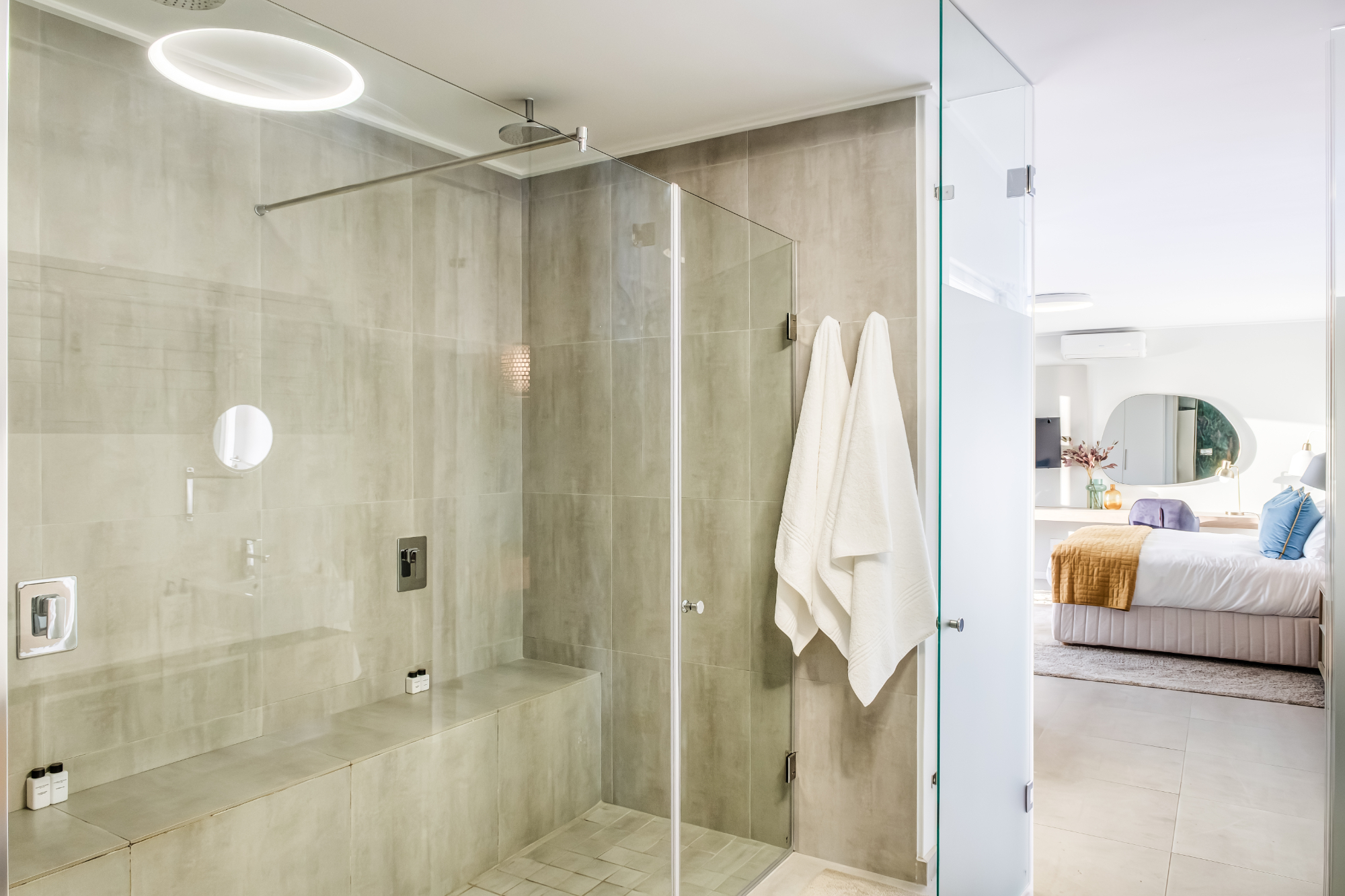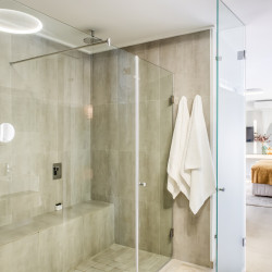 Open plan bathroom, shower and double vanity