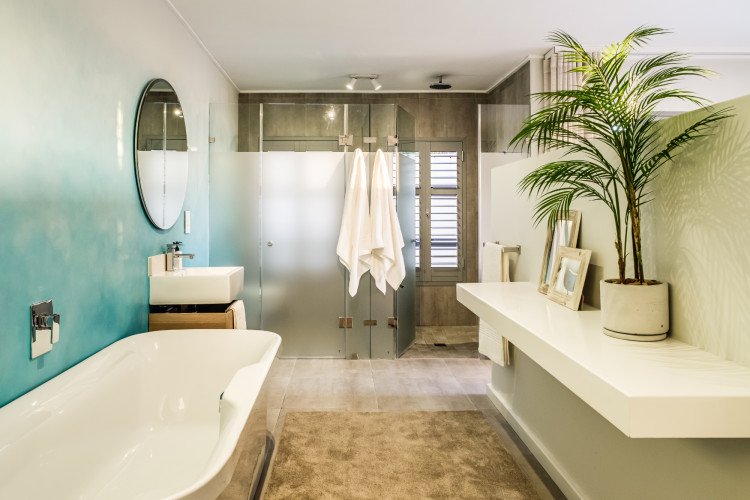 Open plan bath, shower and double vanity
