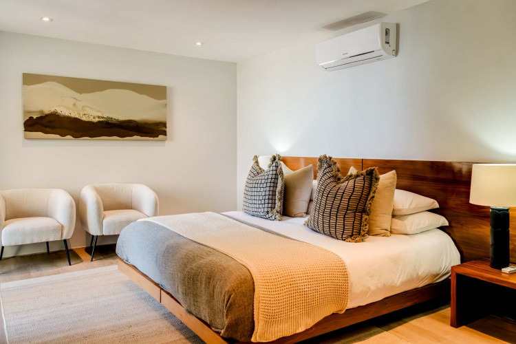 Each of the five bedrooms offers air conditioning, with the main bedroom featuring a king bed, a private balcony with serene seating, and a luxurious ensuite bathroom. The spacious living and dining areas, adorned with a gas fireplace and a state-of-the-art sound bar, provide ample space for relaxation and entertainment.