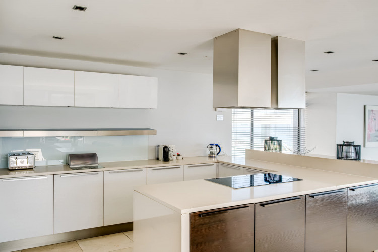 The gourmet kitchen, equipped with a gas hob and Nespresso machine, invites culinary indulgence against the backdrop of sweeping sea vistas.