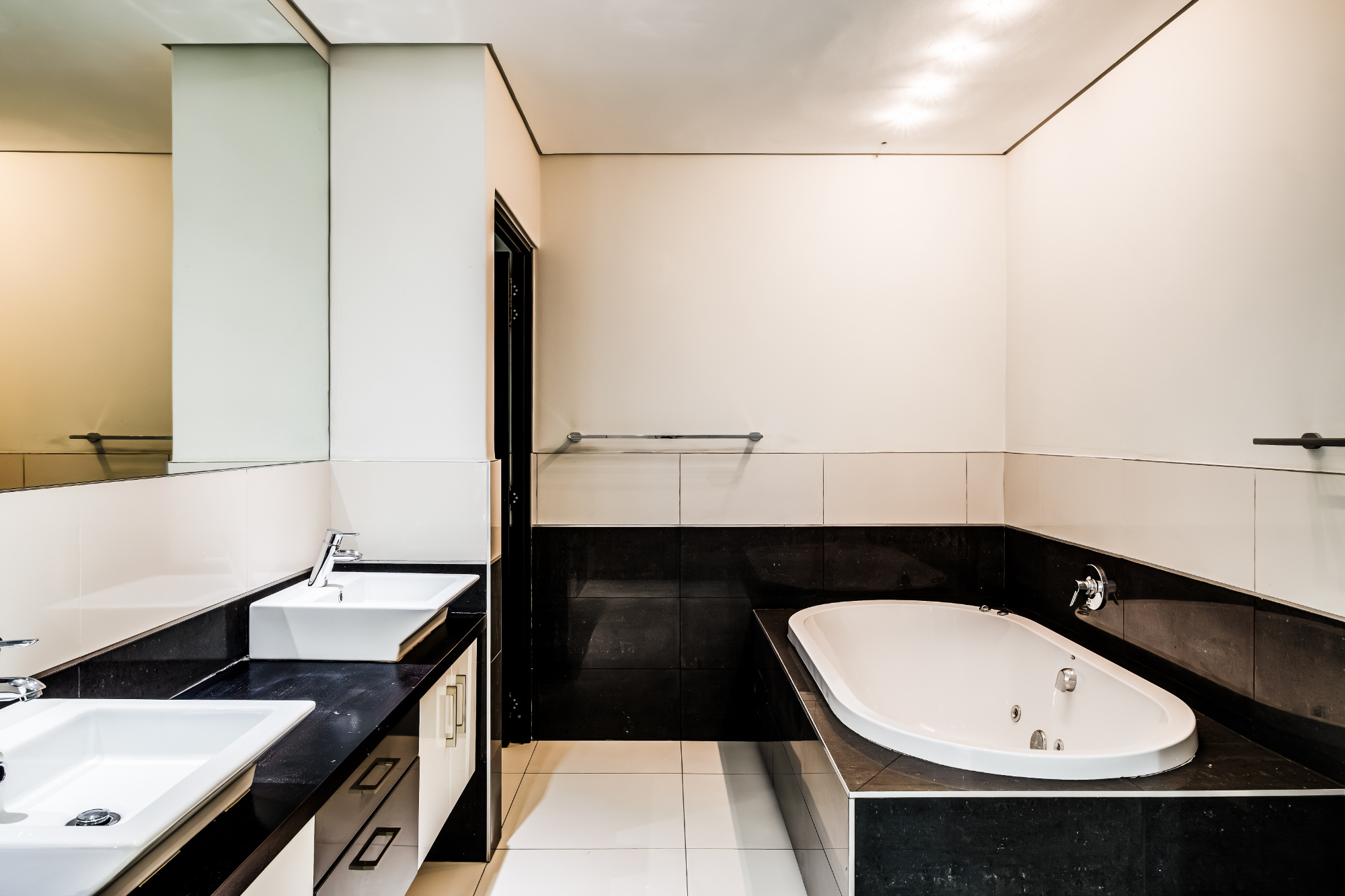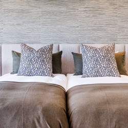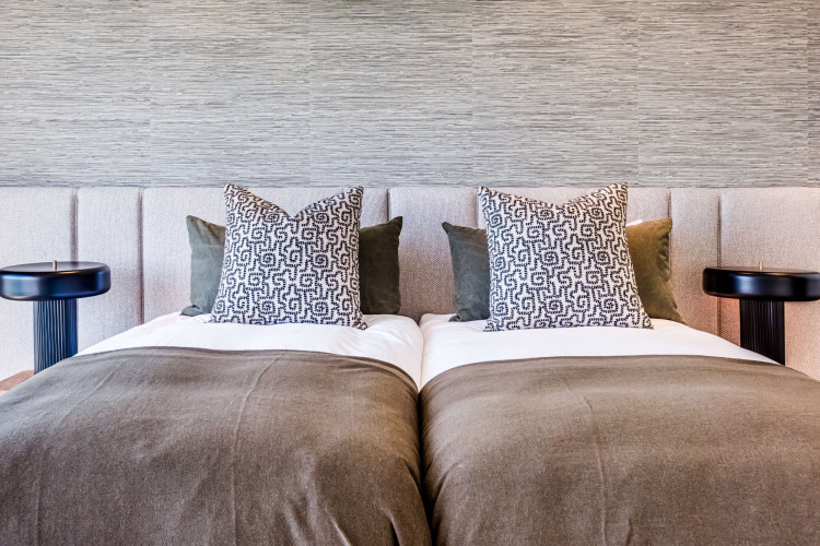 The third bedroom is perfect for friends or siblings, fitted with twin beds and air conditioning. It also has its own ensuite bathroom with a bath, shower, and single vanity, ensuring everyone has their private space.