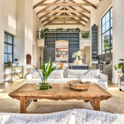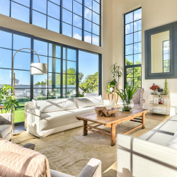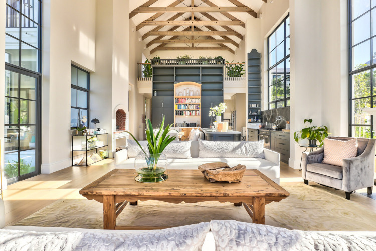 Indoor spaces are voluminous, both in height and breadth. Double volume floor to ceiling glass windows allow an abundance of natural light to stream in. Décor is immaculate and inviting, understatedly plush in muted tones of beige and grey, complemented by original artifacts and layered with splashes of colour in a considered selection of curated furniture, throws, scatter cushions, and rugs.