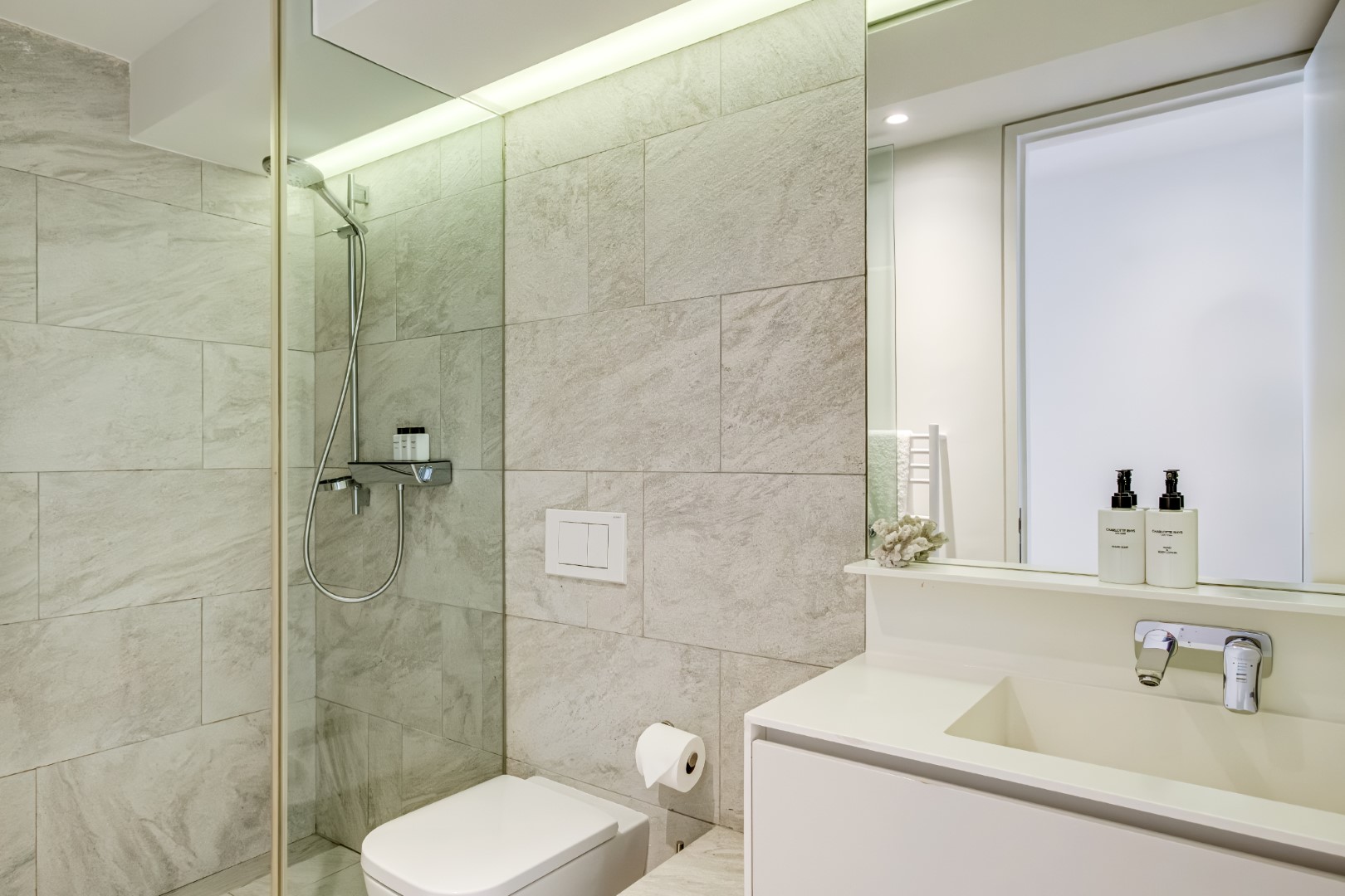 Dedicated bathroom with shower and single vanity (also used as guest toilet)