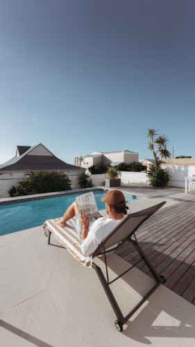 The lounge opens up to the Pool Deck, with Sunloungers, Outdoor Dining Table and Chairs, as well as Chairs to rest.