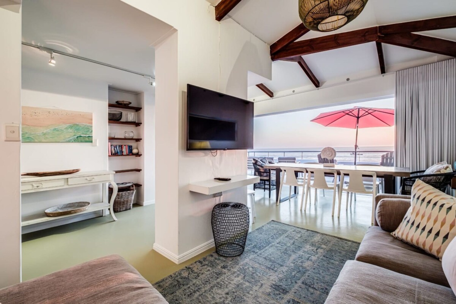 Outside on the Balcony there is plenty of comfortable seating as well as outdoor dining for 8, a Weber BBQ and Sea and Mountain Views. Below the balcony is a lovely pool deck with loungers.