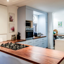 There are two bedrooms upstairs which have twin beds and share a bathroom, and further two bedrooms downstairs which have King-size beds and en-suite Bathrooms.